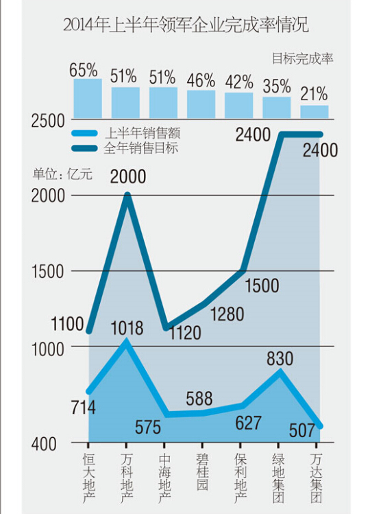 7家领军房企中,有5家实现业绩快增:最快的是碧桂园,业绩同比增长74%,其次是恒大58%,万达37%,排名第四、五的绿地和万科分别为27%、22%;目标完成率也较好:恒大以64%完成率领衔TOP50榜,中海、万科都过半,碧桂园、保利地产也超过四成。
