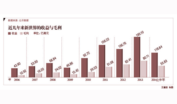 看起来,土地溢价带给新世界发展极高的利润,以2013财年为例,新世界中国的收益为195.1亿港元,毛利为80.11亿港元,几乎是收益的一半,净利润也高达46.16亿港元,净利润率为23.65%,远高于行业10%的平均水平,但是规模却始终没有做起来。