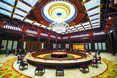 ▲会议中心二层的集贤厅是APEC领导人非正式会议圆桌会议的场地。1200平方米的会议厅中间摆放圆桌和明代式样座椅,天花板悬挂莲花造型水晶吊灯,地面铺设团花地毯,彰显中国特色。