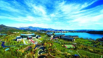 ▲登上雁栖塔顶,核心岛上的会议中心、精品酒店和贵宾别墅尽收眼底。