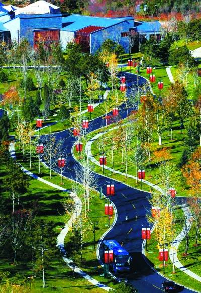▲岛内道路联络起雁栖湖国际会议中心、雁栖酒店、雁栖塔等岛内建筑群,蜿蜒环绕,相互呼应。