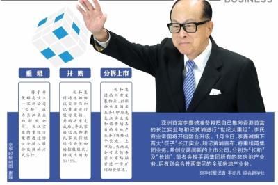 亚洲首富李嘉诚准备将把自己推向香港首富的长江实业与和记黄埔进行“世纪大重组”,李氏商业帝国将开启整合升级。1月9日,李嘉诚旗下两大“巨子”长江实业、和记黄埔宣布,将重组两集团业务,并创立两间新的上市公司,分别为“长和”及“长地”,前者会接手两集团所有的非房地产业务,后者则会合并两集团的全部房地产业务。