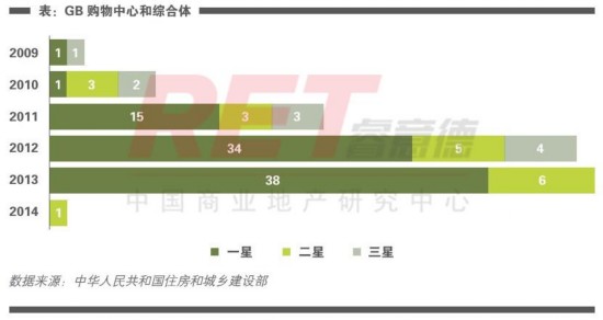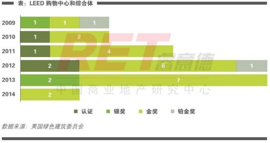 截止2014年6月,全国商业地产项目中共有117个GB认证项目和32个LEED认证项目。其中,所有GB认证项目中80%为一星认证,在LEED认证项目中近70%的建筑为金奖认证。在打造购物中心和综合体时,LEED金奖认证和GB一星认证成为开发商最热衷的选择。