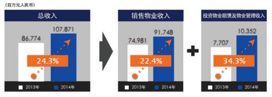值得注意的是,投资物业租赁及物业管理收入103.52亿元,较2013年增长34.32%,毛利率达到了73.89%。尽管投资物业租赁及物业管理业务在营业收入占比上不足10%,但是在营业利润的贡献上占到了40.80%。