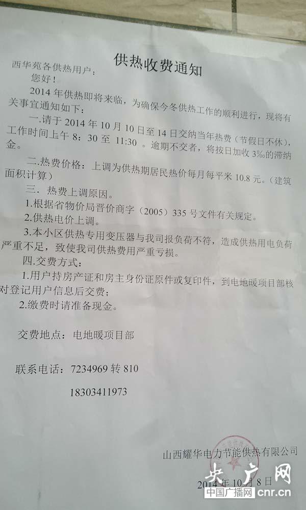 供热公司贴出的供暖费涨价通知(央广网记者 肖源 摄)