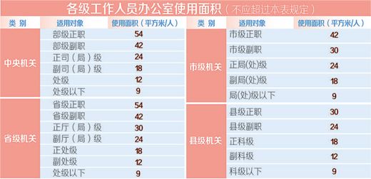 市县两级办公用房面积标准调整较大。中央机关、省级机关的省部级正职办公室使用面积维持54平方米不变,市级正职的办公室使用面积由32平方米增加到42平方米,县级正职由20平方米增加为30平方米。乡级机关由省级人民政府按照中央规定和精神自行规定,原则上不得超过县级副职。