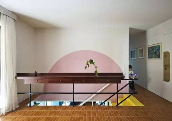 这所明亮、活泼极具色彩的公寓是专门为孩子设计的,大胆采用各种颜色和简明的几何形图案营造亲切、可爱的生活气息。整间公寓分为两大部分,中间由楼梯连接。楼下开放式的设计增强空间感;而楼上从楼梯开始沿用了活泼的色彩,门上的小细节、楼梯的顶端的粉红色旭日等,温馨,活泼。就连浴室,也换上了粉色的墙面。这个色彩缤纷的家绝对是孩子们的爱!