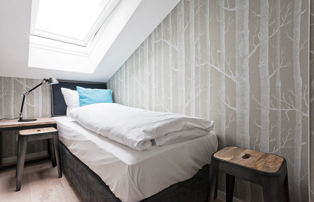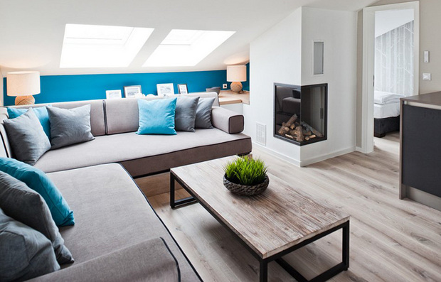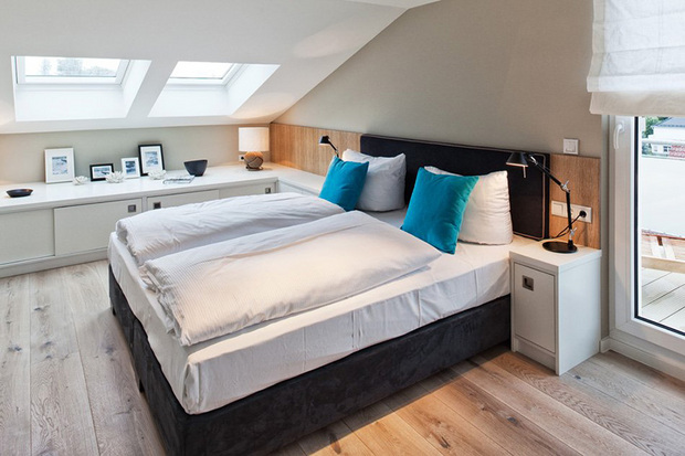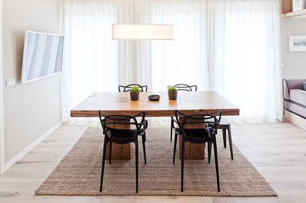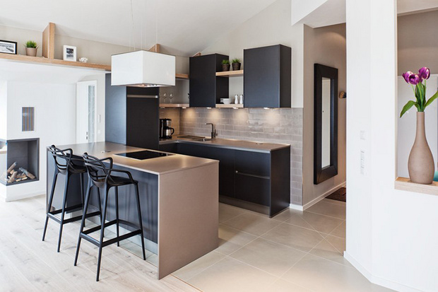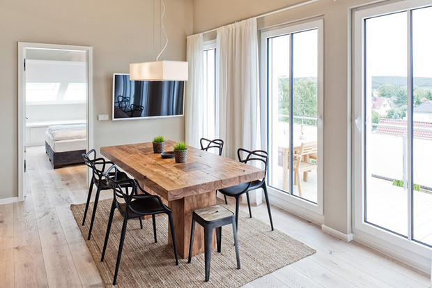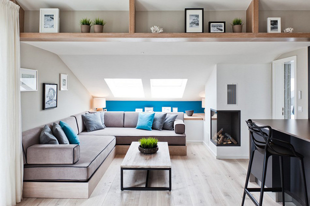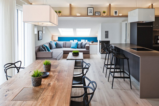 来自柏林的设计师Susanne Kaiser将家布置的像海边度假屋。餐厅的木桌、大地色地毯和沙发,在加上一抹蓝墙,蓝色和原木果然是最富有海洋自然气息的搭配!白色窗纱则是透光性最强的首选,能柔和照射进来的阳光,过滤光源却不会变得厚重,也利于空气流动。富有现代感的黑色餐椅和厨房黑色木柜,除了耐脏之外,也给让整体空间了沉稳的感觉。厨房和客厅之间利用位于屋梁橡木书架串联起来,不只增加了收纳空间,还因为装有间接照明,因此能在夜晚成为不错的照明工具。