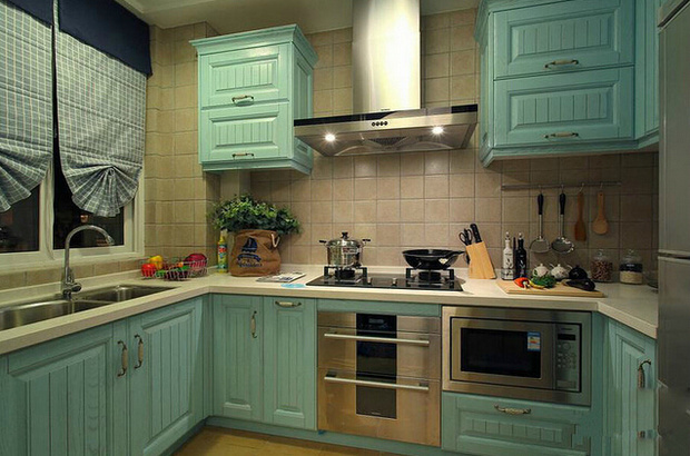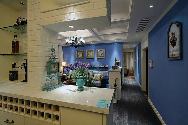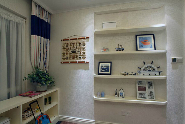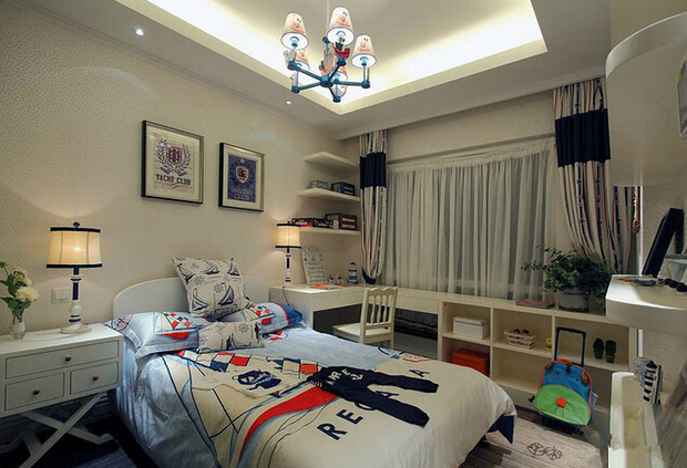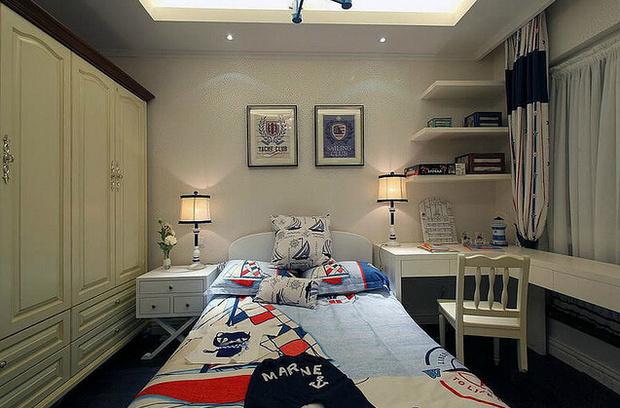 本案设计师胆大心细,总突破常规,细节考虑周全。集装饰和收纳为一体的纯净清水蓝墙面、转角书架和弧形书桌都是本案的亮点。清凉感十足的蓝色背景也给人安定的感觉。